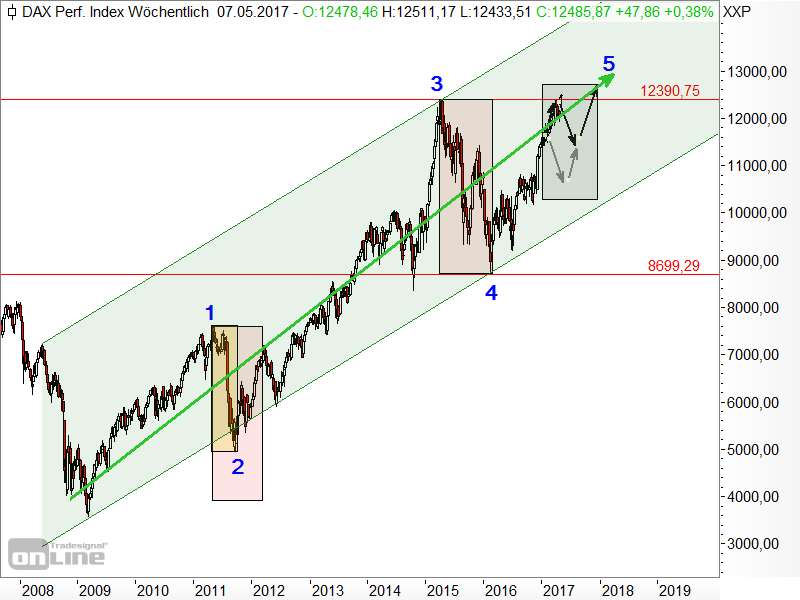 Bis zu dem aktuellen Zeitpunkt hat sich der Markt für die bullishe Variante entschieden (schwarze Pfeile). Und auch jetzt ist noch nicht eindeutig zu klären, WANN und von welchem Niveau aus es zu dem schärferen Rücksetzer kommt. Doch ich bin mir ziemlich sicher, DASS es noch in diesem Jahr dazu kommen wird.