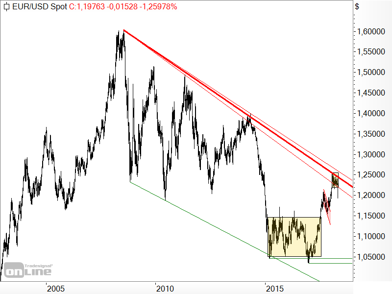 Im Extremfall hat der seit Ende 2017 gültige Aufwärtstrend sein Ende gefunden und der seit Mitte 2008 laufende Abwärtstrendkanal wird fortgesetzt (siehe folgender Chart). Damit wäre sogar die Parität zwischen US-Dollar und Euro wieder möglich - also ein Wechselkurs von 1 zu 1.
