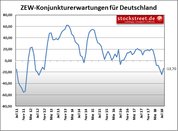 So sind die ZEW-Konjunkturerwartungen für Deutschland im August 2018 um 11,0 Punkte gestiegen. Es war der erste Anstieg seit Februar. Zwar liegt deshalb auch der neue Index-Wert noch 13,7 Punkte im Minus, doch hat die kürzlich zustande gekommene Einigung im Handelsstreit zwischen der EU und den USA die Stimmung deutlich aufgehellt.