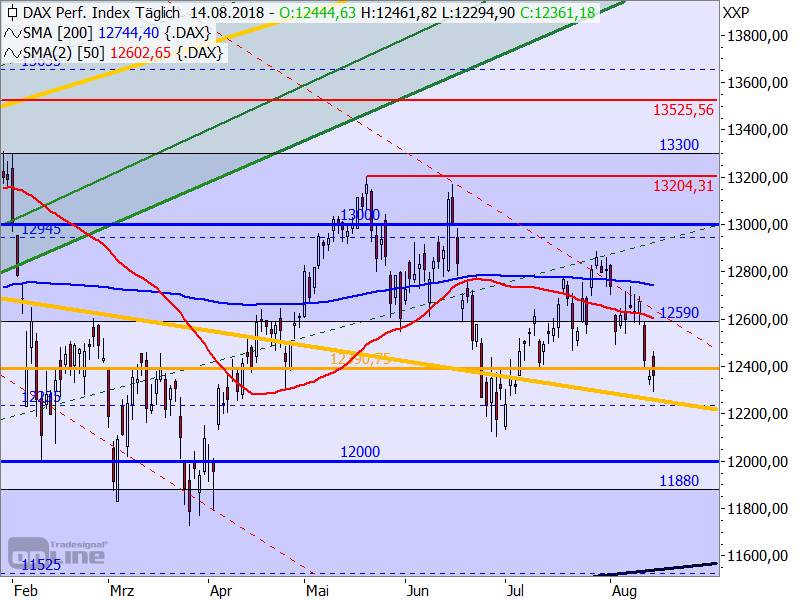 Das muss nun nicht zwingend einen Trendwechsel bedeuten. Es kann auch auf eine Fortsetzung der Seitwärtstendenz hinauslaufen, in der sich der DAX übergeordnet betrachtet schon seit Monaten befindet. Aber auch in diesem Fall droht nun ein Rückfall in Richtung des Tiefs bei 12.104,41 Punkten.