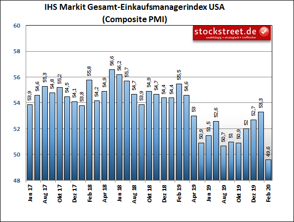 Allerdings – und jetzt kommt der Haken an der Sache – dürften die Umfragewerte noch nicht die inzwischen weitergehende Ausbreitung des Coronavirus als weltweite Pandemie beinhalten. Für März sind daher wieder deutlich schwächere Umfragewerte zu erwarten. Und diese Erkenntnis setzte sich am Freitag bereits durch, als die vorläufigen Einkaufsmanagerdaten zur US-Wirtschaft veröffentlicht wurden.