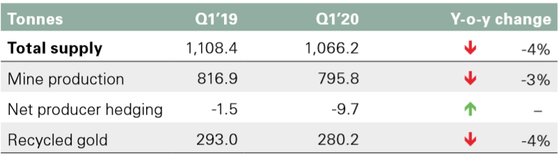 Und so könnte der Goldpreis seit dem Einbruch im März auch eher deswegen wieder gestiegen sein, weil das Angebot als Folge der Krise gesunken ist. Die Minenproduktion fiel aufgrund von Störungen in den Betrieben im Vergleich zum 1. Quartal 2019 um 3 % auf 795,8 t und erreichte damit ein Fünfjahrestief. Da auch weniger Gold recycelt wurde (-4 % auf 280,2 t, ein 2-Jahrestief), sank das Gesamtangebot im 1. Quartal um 4 % zum Vorjahr.