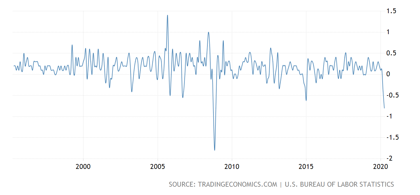 Die Verbraucherpreisinflation legt derweil eine klare Pause ein. Denn heute wurde in den USA gemeldet, dass der Verbraucherpreisindex im April gegenüber dem Vormonat um 0,8 % gesunken (!) ist, nach bereits -0,4 % im März. Das ist der stärkste monatliche Rückgang seit Dezember 2008 und damit – wie soll es auch anders sein – seit der Finanzkrise.