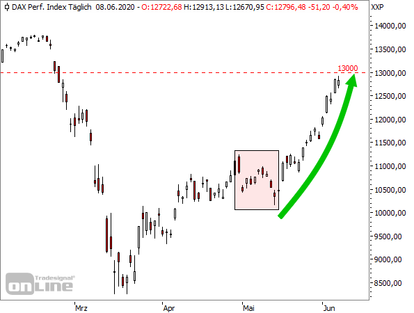 Da der DAX zudem seit seinem März-Tief nur eine sehr kurze Konsolidierung absolvierte (siehe rotes Rechteck), ist er nach wie vor stark überkauft. Überwertet ist er sowieso. Und nach so einer starken Rally ist doch ohnehin eine Korrektur zu erwarten. Daher könnte an der 13.000-Punkte-Marke für die Bullen erst einmal Schluss sein.