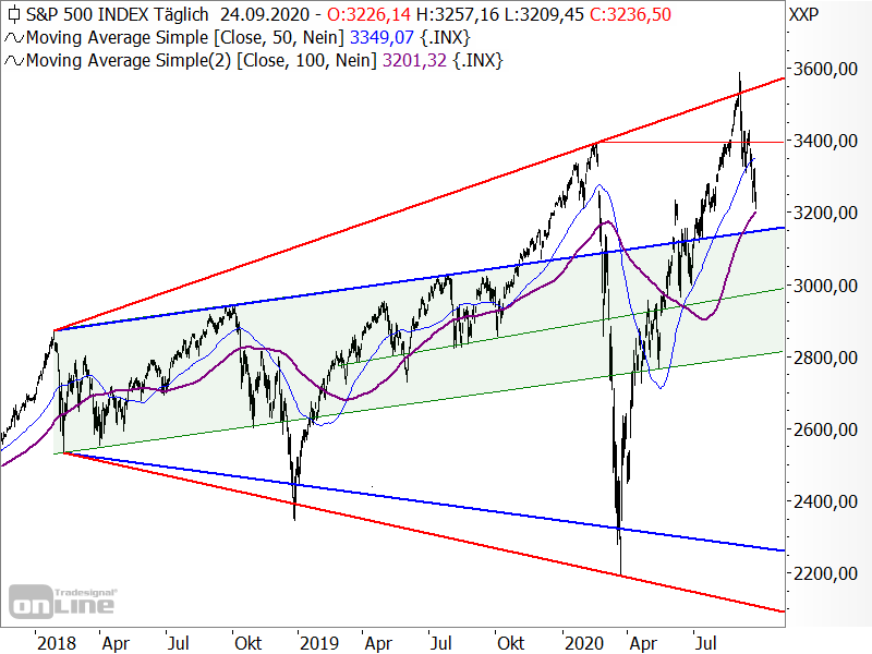 Inzwischen ist der S&P 500 jedenfalls bereits unter das Vor-Krisen-Niveau zurückgefallen (rote horizontale Linie), womit der Ausbruch darüber genauso ein Fehlsignal war wie der Anstieg über die obere Linie der Trompetenformation (rot).