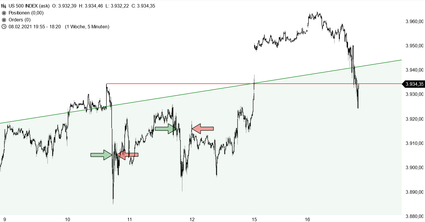 Mit den beiden grünen Pfeilen ist hier jeweils ein Einstieg in einen Short-Trade markiert. Und mit den beiden roten Pfeilen ist jeweils das Ende des Trades durch einen schnell platzierten Stop-Loss auf Einstandskurs gekennzeichnet.