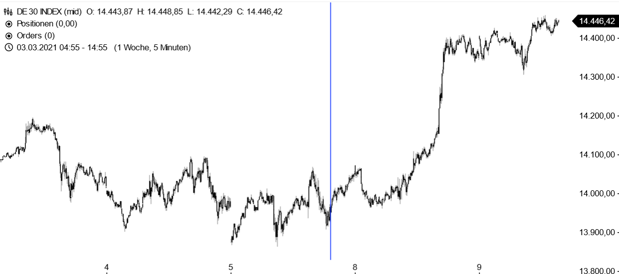 Und diese Meldung traf bereits am Freitag auf die Märkte. Genau zu diesem Zeitpunkt kam es zu einer kleinen Intraday-Trendwende, die sich zum Wochenbeginn fortsetzte und beschleunigte. Dazu müssen wir uns den Kursverlauf im Future-Handel anschauen. Denn aufgrund der deutlich längeren Handelszeiten ist der Zusammenhang von Kursanstieg und Nachricht hier wesentlich besser zu erkennen. Zumal der Xetra-Handel des DAX zum Zeitpunkt der Meldung bereits beendet war. Gegen 18 Uhr am Freitag lief die Nachricht zu den Zöllen bei Reuters über die Ticker (siehe blaue Linie im folgenden Chart). Genau zu dieser Zeit drehte der DAX nach oben.