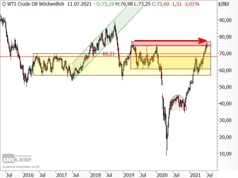 Im Hoch stieg die Öl-Sorte West Texas Intermediate (WTI) heute auf 76,98 USD. Und damit stieß der Preis ziemlich exakt an das Hoch vom 28.04.2019, welches bei 77,13 USD markiert wurde (siehe roter Pfeil im folgenden Chart).