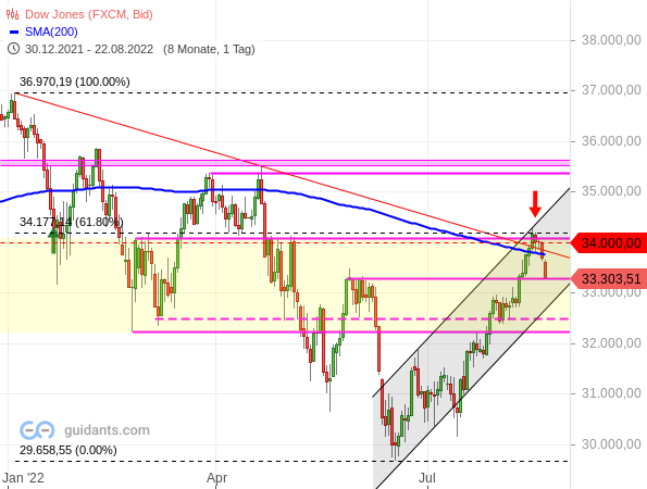 Hier gibt es sogar noch mehr Widerstände am jüngsten Hoch: Da ist zum einen ein klassischer Widerstand (violette Linie) oberhalb von 34.000 Punkten, die runde 34.000-Punkte-Marke selbst sowie die Abwärtslinie seit dem Januar-Hoch. Hinzu kommen das 61,8%-Fibonacci-Niveau der gesamten Abwärtsbewegung seit Januar (schwarz gestrichelte Linien) und der 200-Tage-Durchschnitt (blaue Kurve).