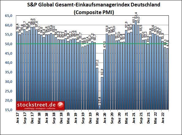 Die Stimmungsindikatoren für die deutsche Wirtschaft liegen damit allesamt unterhalb der Schwelle von 50, ab der Wachstum signalisiert wird.