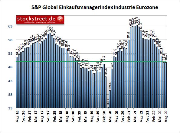 Und ähnliches gilt auch für die Wirtschaft der Eurozone. Der Index für das verarbeitende Gewerbe gab hier von 49,8 auf 49,7 Punkte überraschend nur leicht nach (Konsenserwartung: 49,0), es war aber der siebte Rückgang in Folge. Und dieser führte ebenfalls auf ein 26-Monats-Tief.