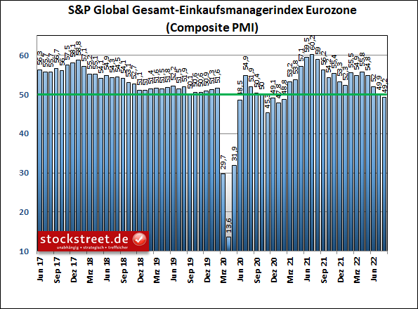 Da verwundert es auch nicht, dass die Einkaufsmanager erneut skeptischer gestimmt sind. Bei der Umfrage von S&P Global legte der Index für das verarbeitende Gewerbe zwar überraschend von 49,3 auf 49,8 Punkte leicht zu (Konsenserwartung: 48,2), der Dienstleistungsindex (siehe folgende Grafik) brach aber von 49,7 auf 48,2 mit dem vierten Rückgang in Folge auf ein 18-Monats-Tief weiter ein (Erwartung: 49,0).