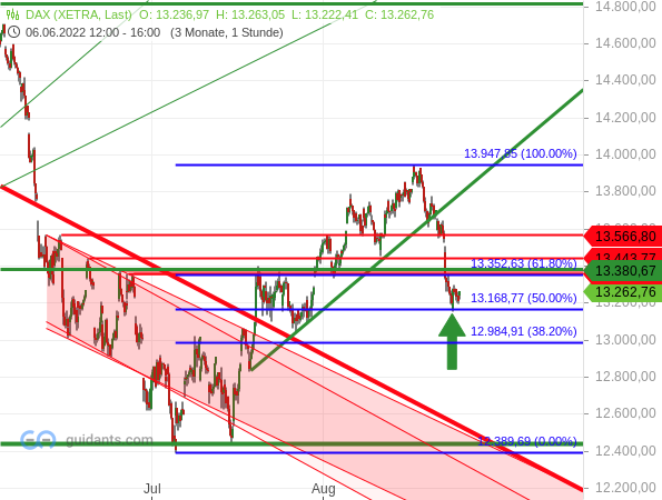 Allerdings hat der Index eine Reihe wichtiger Linien und Marken durchbrochen. So wurde die Aufwärtsbewegung nicht nur durch den Bruch der Aufwärtstrendlinie (dick grün) beendet, sondern auch die Folge höherer Tiefs hat durch das Unterschreiten zweier Zwischentiefs ein Ende gefunden. Zudem wurden die horizontalen Hürden bei 13.566, 13.443 und 13.358 Punkten wieder unterschritten (rote Linien). Zu diesen Marken hatte ich am 3. August noch geschrieben, dass ein erneuter Rücksetzer reicht, damit es für die Bullen schon wieder gefährlich wird, weil sich der DAX wenig volatil und auf relativ engem Raum bewegt hatte.