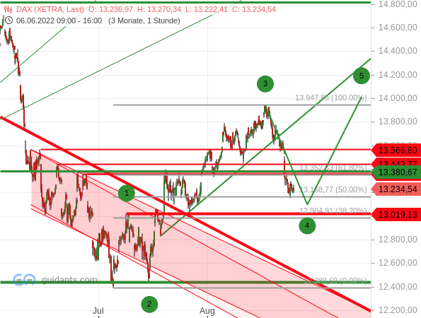 Noch ist das Szenario allerdings nicht hinfällig. Kann sich der DAX oberhalb des Hochs der möglichen Welle 1 bei 13.019,13 Punkten halten und bald wieder nach oben drehen, bleibt die Chance auf eine Fortsetzung der Kurserholung erhalten. Andernfalls muss man den Blick wieder nach unten richten.