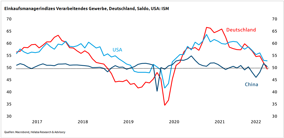 Viel wichtiger ist mir deshalb heute der Hinweis, dass die Leitzinsen immer noch relativ niedrig sind. Auf den aktuellen Niveaus wird sowohl die europäische als auch die US-amerikanische Wirtschaft noch stimuliert, also angeheizt. Das erscheint angesichts der rezessiven Tendenzen, die sich vor allem in den Einkaufsmanager-Indizes zeigen (siehe folgende Grafik), auch sinnvoll.