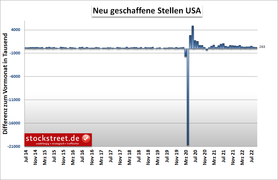 Eigentlich ist dies ein Grund zur Freude und zum Optimismus. Denn es scheint der US-Wirtschaft noch recht gut zu gehen, wenn die Unternehmen fleißig Mitarbeiter einstellen und neue Arbeitsplätze schaffen. Im September waren es laut dem Bericht immerhin 263.000. Erwartet worden waren im Durchschnitt „nur“ 250.000, nach 315.000 im August. Zudem wurde der Wert für Juli von 528.000 auf 537.000 nach oben revidiert.