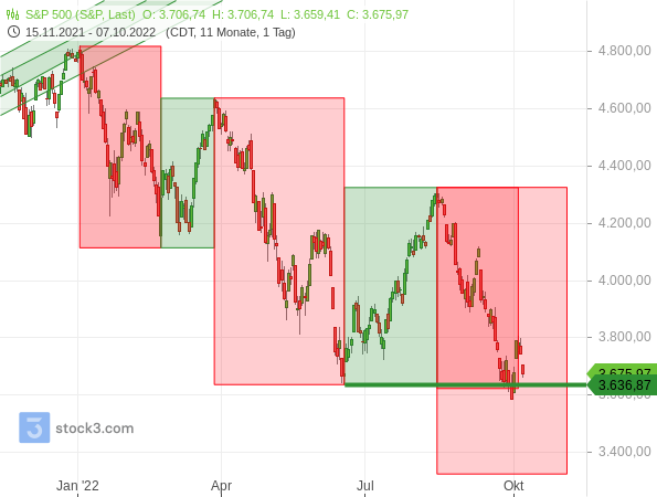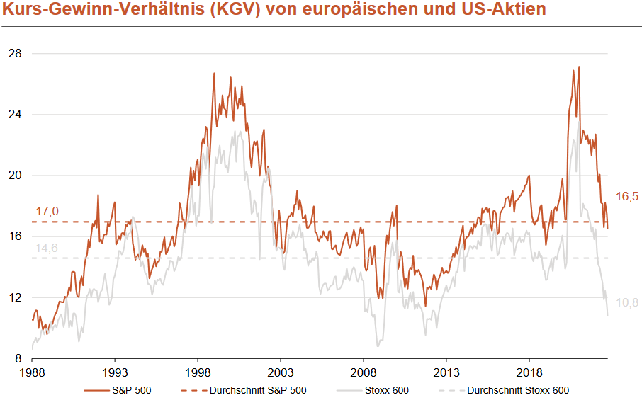 Zudem sind die US-Indizes immer noch relativ hoch bewertet. Am 13. September hatte ich berichtet, dass das Kurs-Gewinn-Verhältnis (KGV) des S&P 500 mit 18,0 noch oberhalb seines historischen Durchschnitts von 17,0 lag. Damals notierte der Index bei rund 4.100 Punkten. Heute ist er wieder auf unter 3.700 Punkte gerutscht. Er ist also etwa 10 % günstiger zu haben. Aufgrund sinkender Gewinnerwartungen ist das KGV aber nicht ebenfalls um 10 % gefallen, sondern statt bei 16,2 bislang „nur“ bei 16,5 angekommen.
