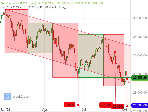 Übrigens: Kursverluste von 10 % bis 15 % würden für den Dow Jones ein Kursziel von ca. 26.600 bis 25.100 Punkte bedeuten. Und in diesem Zusammenhang bekommt mein obiger Verweis auf die Börse-Intern-Ausgabe vom 13. September eine besondere Bedeutung. Denn der Titel dieser Ausgabe lautet „Dow Jones: Kursziel 26.700 Punkte?“. Folgen Sie also dem Link und schauen Sie sich die damalige Analyse gerne noch einmal an!