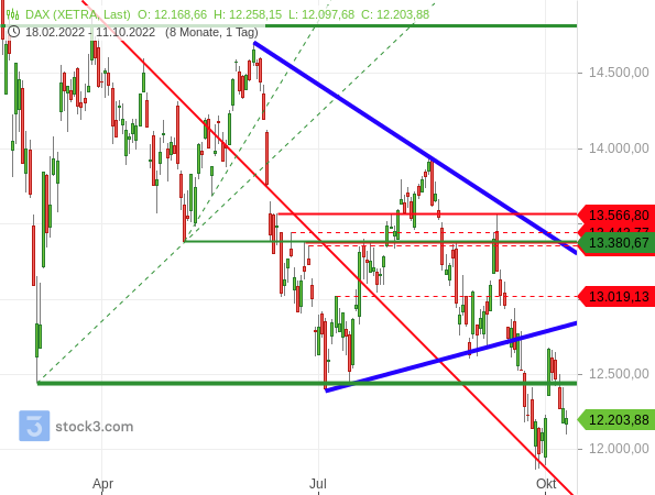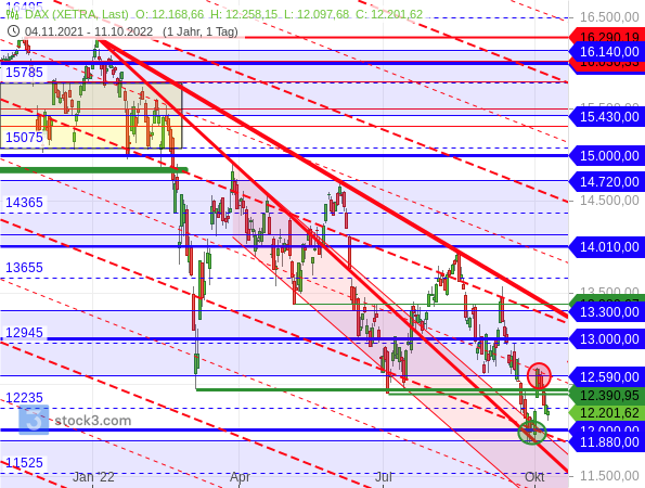 Und damit ist nun klar, wohin der DAX als nächstes laufen könnte bzw. auf welche Marken es aktuell besonders zu achten gilt: Rutscht der DAX unter die Rechteckgrenze bei 11.880 Punkten, muss man mit weiter fallenden Kursen rechnen, steigt er hingegen über die Rechteckgrenze bei 12.590 Zählern, hat der deutsche Leitindex wahrscheinlich sein (Jahres-)Tief gefunden.