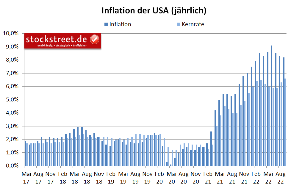 Nach den gestrigen US-Erzeugerpreisen folgten heute die für die Geldpolitik der US-Notenbank wesentlich bedeutenderen US-Verbraucherpreisdaten. Und auch diese enttäuschten wieder die Markterwartungen. Die jährliche Inflation ging im September zwar auf 8,2 % zurück, die Kernrate stieg aber auf +6,6 %. Und sie markierte damit sogar ein neues zyklisches Hoch.