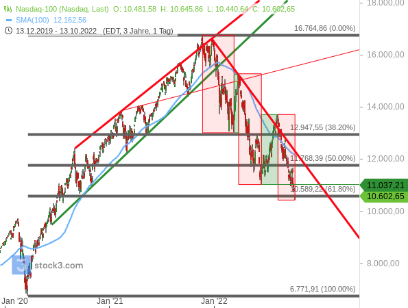 Und so setzten die Börsen erneut darauf, dass die Notenbanken die geldpolitischen Zügel noch straffer anziehen werden. Die Anleihen- und Aktienkurse gaben massiv nach. Der Nasdaq 100 verlor zum Beispiel aus dem Stand binnen nur einer Minute mehr als 3,4 %. Er brach damit auf ein neues Korrekturtief ein, wie auch viele weitere relevante Aktienindizes.