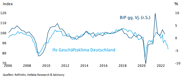 Trotz des leicht über den Erwartungen liegenden Wertes ist dessen Entwicklung klar negativ zu werten. Schließlich ist das ifo Geschäftsklima auf ein neues Tief im aktuellen Abwärtstrend und auf den niedrigsten Stand seit Mai 2020 gefallen. Dies lässt nichts Gutes für das deutsche Bruttoinlandsprodukt (BIP) erahnen, welches wohl kaum noch um eine Schrumpfung herumkommen wird. Denn die folgende Grafik der Landesbank Hessen-Thüringen (Helaba) zeigt einen klaren Zusammenhang zwischen ifo-Daten und BIP, wobei der ifo-Index ein vorlaufender Indikator ist.