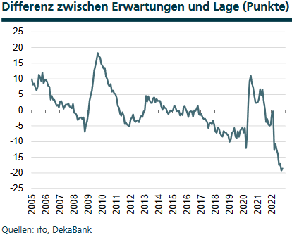 Und da die Börse die Zukunft handelt, kommt es am Aktienmarkt meist zu einer Wende, wenn sich die Lageeinschätzung zwar noch eintrübt, die Zukunftserwartungen aber bereits aufhellen. Und das ist aktuell der Fall, allerdings von einem extrem niedrigen Niveau aus. Die Geschäftserwartungen liegen aktuell auf dem drittschlechtesten jemals gemeldeten Wert. Nur zu den Anfängen der Corona-Krise wurde bei den Erwartungen ein noch niedrigeres Niveau erreicht, wobei die Differenz zwischen Erwartung und Lage aktuell wesentlich größer ist als damals.