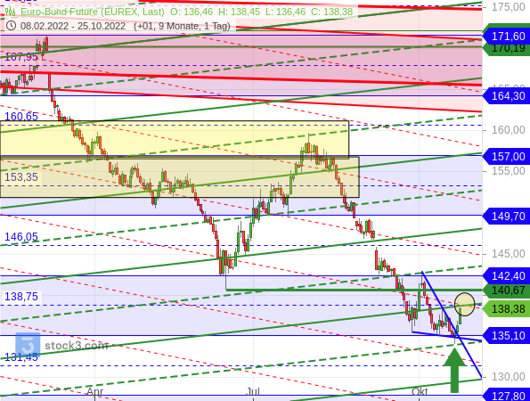Der Bund-Future hat das abfallende Dreieck also tatsächlich nach oben aufgelöst und den Bereich des Targets bereits erreicht. Sehr wahrscheinlich wird nun auch dessen Zentrum an der Mittellinie bei 138,75 Punkten getroffen.