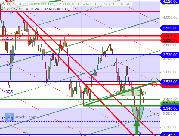 Wie gut, dass ich den Lesern am 29. September zu einer kleinen Long-Position geraten hatte, die man damals zum Eröffnungskurs von 3.333 Punkten eingehen konnte. Auch diesen Trade kann man bereits auf Einstiegskurs absichern, um damit Verluste nahezu auszuschließen und die Gewinne weiter laufen zu lassen.