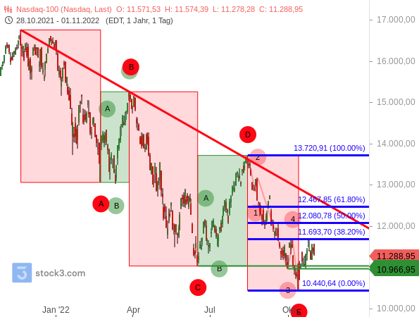 Der Technologieindex Nasdaq 100 konnte sich angesichts dieser Schwächen bislang von seinem Korrekturtief kaum erholen. Lediglich 38,20 % der letzten Korrekturwelle konnten zurückerobert werden.