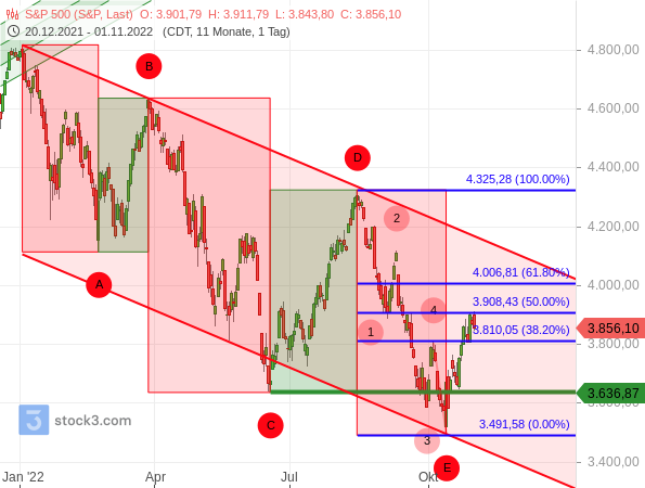 Etwas besser hat sich der S&P 500 geschlagen. Er konnte kürzlich immerhin das 50%-Fibonacci-Retracement seiner dritten Korrekturwelle erreichen.