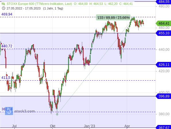 Dennoch: Wenn man sich den Kursverlauf des STOXX (Europe) 600 anschaut, der sich kaum von seinem Erholungshoch an der Mittellinie bei 469,94 Punkten entfernt hat (siehe folgender Chart), scheint derzeit die Freude über den positiven Verlauf der aktuellen Berichtssaison und die erhöhten Prognosen für das 2. und 3. Quartal zu überwiegen.
