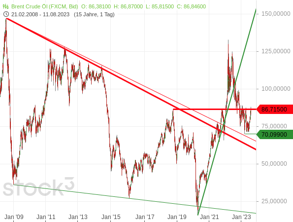 Dazu passt, dass der Brent-Preis eine wichtige horizontale Widerstandslinie erreicht hat.