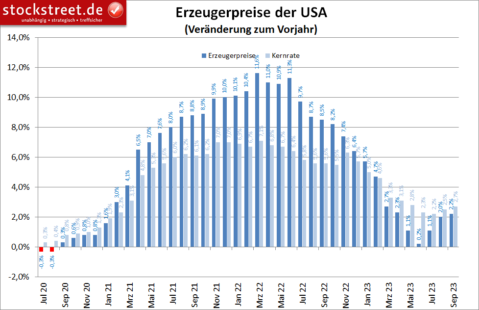 Um Hinweise auf die Notwendigkeit einer weiteren Leitzinsanhebung zu erhalten, sollte man auch die Preis- und Inflationsdaten weiterhin genau im Auge behalten. Heute wurde der Erzeugerpreisindex der USA für den Monat September veröffentlicht. Und dieser fiel höher als erwartet aus. Zum Vormonat gab es einen Anstieg um +0,5 %, statt erwarteter +0,3 %. Immerhin: Im August lag der Anstieg noch bei +0,7 %.
