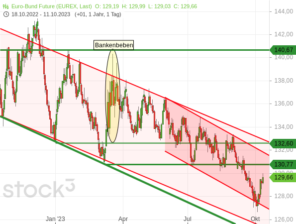 Beim Bund-Future hat dies nun dazu geführt, dass „sowohl der übergeordnete als auch der kurzfristige Abwärtstrendkanal fortgesetzt wird“, genau wie vor einer Woche geschrieben.