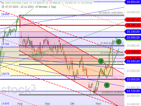 Auch dieses Niveau war für die Bullen aber noch kein Grund, eine Pause einzulegen, obwohl mit der Mittellinie bei 15.785 und dem 61,80er Fibonacci-Retracement bei 15.803,64 Punkten weitere Hürden im Weg lagen. Stattdessen zog die psychologisch wichtige Marke von runden 16.000 Punkten die Kurse an, die heute im Tageshoch fast punktgenau erreicht wurde.