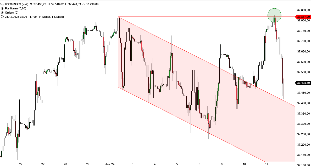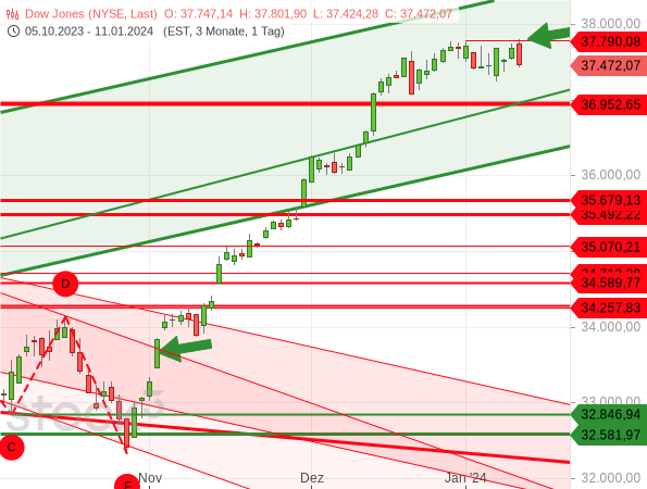 Allerdings prallte der Index letztlich von dem bisherigen Rekordhoch dynamisch nach unten ab, womit nun eine Art Doppeltop im kurzfristigen Bereich droht. (Für ein echtes großes Doppeltop liegen die beiden Hochs zu nah aneinander.) Dieses wird allerdings erst zu einer gefährlichen Formation, wenn das Tief vom 8. Januar bei 37.226 Punkten unterschritten wird. Sollte es so kommen, könnte dies der Auftakt für eine größere Korrektur sein.