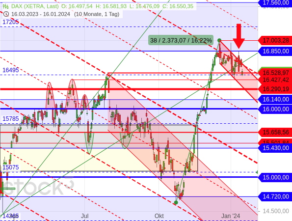 Dennoch ist es dem DAX noch nicht gelungen, sich aus seinem kurzfristigen Abwärtstrendkanal zu befreien. Ein Ausbruchsversuch der Bullen scheiterte exakt an der Rechteckgrenze bei 16.850 Punkten (siehe roter Pfeil im folgenden Chart).