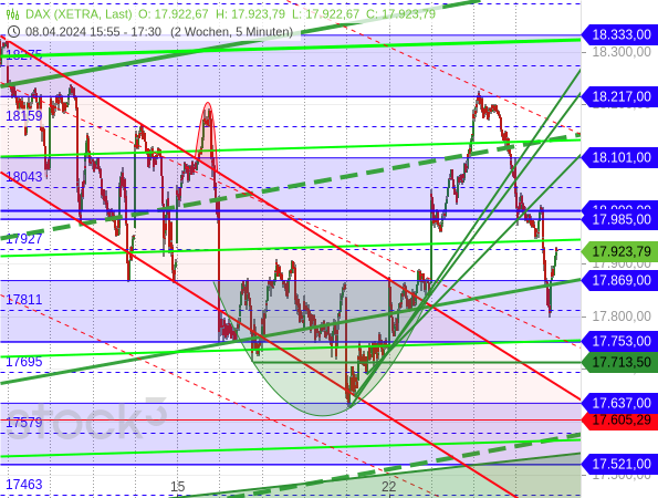 Zugleich war zum DAX zu lesen, dass der deutsche Leitindex nicht unter 17.900 Punkte fallen sollte. Der Grund dafür ist, dass die Kurse in diesem Bereich einen kurzfristigen Boden ausgebildet hatten und am Dienstag dynamisch aus der Bodenbildungsformation nach oben ausgebrochen waren. Am besten zeigt dies der folgende 5-Minutenkerzen-Chart, der im Börsenbrief „Target-Trend-Spezial“ regelmäßig analysiert wird (siehe grüner Bogen).