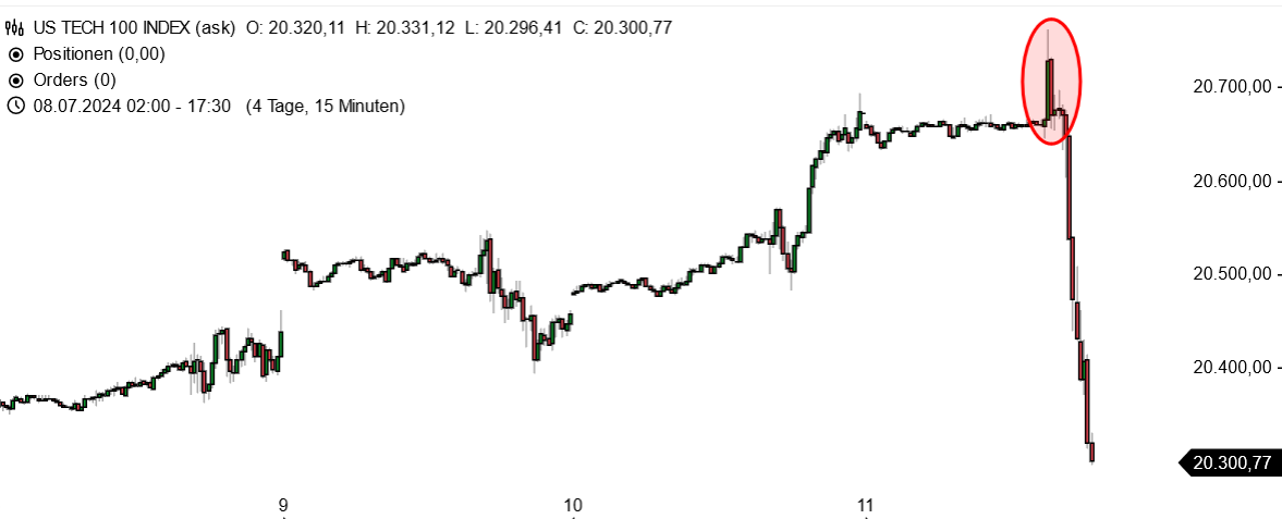 Doch vor allem Technologieaktien konnten ihre anfänglichen Kursgewinne nicht halten, sondern drehten relativ schnell ins Minus (siehe rote Ellipse im folgenden Chart) und brachen dann sogar mit hoher Dynamik ein, wie der folgende Chart des Nasdaq 100 aus dem CFD-Handel zeigt.