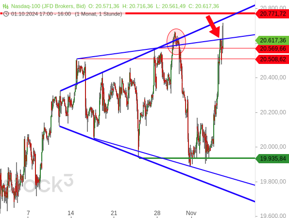 Jedenfalls gab es beim Nasdaq 100 eine ähnlich dynamische Kursexplosion. Der US-Technologieindex schoss zunächst bis zur oberen Linie der flachen Trompetenformation nach oben (siehe roter Pfeil im folgenden Chart). Anschließend machte er sich auch noch auf, die steile Linie zu erreichen, die bald das Rekordhoch bei 20.771,72 Punkten (aus dem CFD-Handel von JFD Brokers) durchläuft (dicke rote Linie).