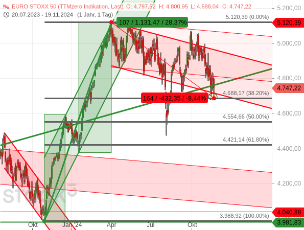 Insgesamt gelang dem Euro STOXX 50 mit diesen beiden Aufwärtswellen ein Kursplus von mehr als 28 %. Und legt man die Fibonacci-Marken an die gesamte Aufwärtsbewegung, so steht der Index aktuell an deren 38,20er Retracement.