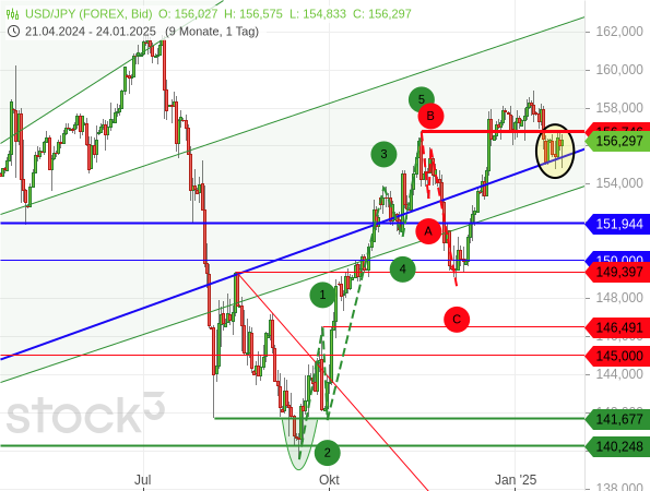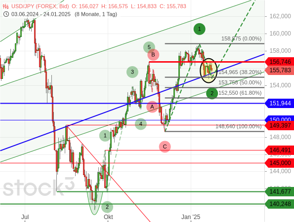 Zwar ist diese moderate Kursreaktion verständlich, weil der Zinsschritt so erwartet worden und somit wahrscheinlich bereits eingepreist war, doch für mich ist das eine kleine Enttäuschung. Denn ich hatte mir einen stärker fallenden USD/JPY gewünscht und auch darauf gesetzt. Beim Trading-Dienst „Target-Trend-CFD“ hatte ich schon am 6. Januar bei 156,85 Yen eine Short-Position eröffnet.