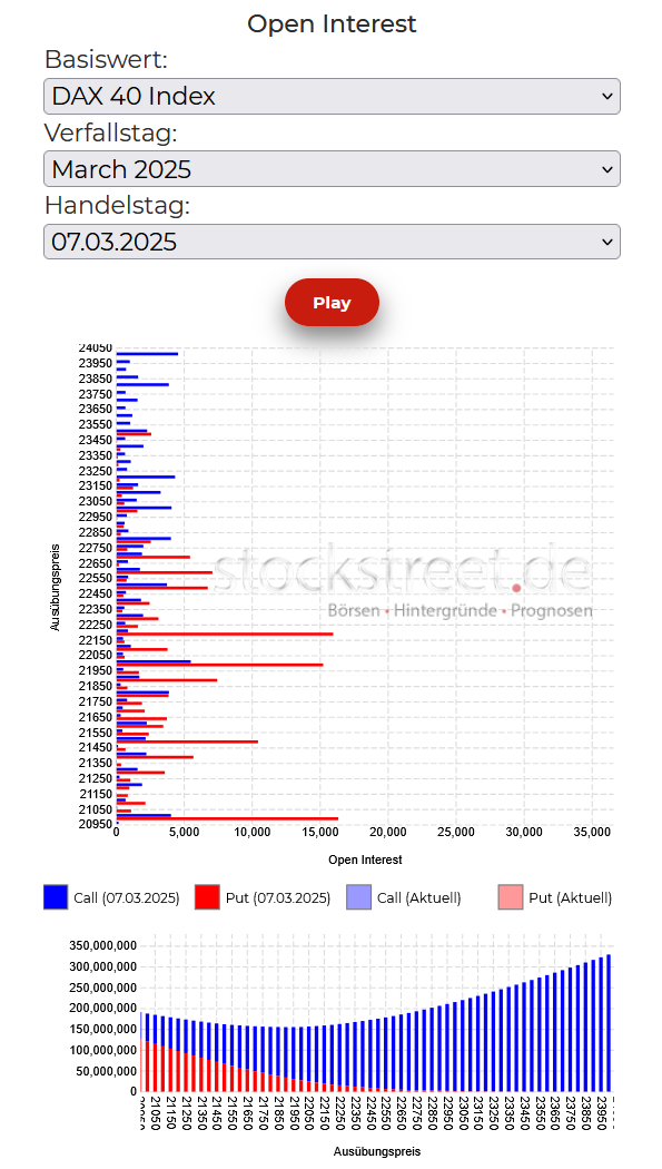 Nach unten wird es nun spannend, denn heute ist der DAX in den Bereich gerutscht, in dem es einige Put-Positionen gibt, die bei weiter fallenden Kursen ins Geld laufen. Sie sind zudem größer als die Calls oben, was ihre Wirkung potenziell verstärkt. Ab 22.500 Punkten würde zudem eine größere Call-Position aus dem Geld laufen, deren Absicherungen also hinfällig werden würden, was die Abwärtsbewegung ebenfalls verstärkt.