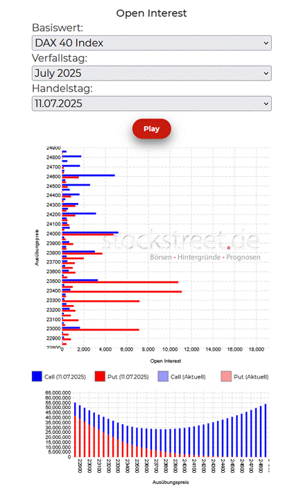 Dann wäre aufgrund der Verfallstagskonstellation ein weiterer Rückgang bis 23.800 Punkte möglich, wo das nächste Doppel von großer Call- und Put-Position liegt und sich dieses Spiel wiederholen könnte. Danach sollte die 23.500-Punkte-Marke – also das Niveau der März-Hochs – das nächste Kursziel auf der Unterseite sein.