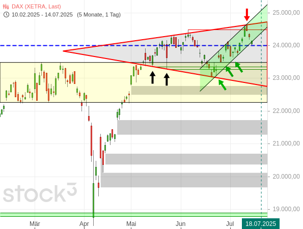 Der (kleine) Verfallstag im Juli steht vor der Tür und zumindest die charttechnische Konstellation des DAX ähnelt der vom Juni: Nach einem neuen Allzeithoch fiel der Kurs dynamisch und vergleichsweise kräftig zurück (siehe Börse-Intern vom 16.06.2025).
