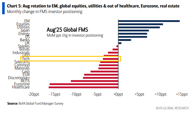 Trotzdem kaufen sie wieder mehr US-Aktien: Der Anteil derer, die US-Aktien in ihren Portfolios untergewichten, ging im August netto um 7 Prozentpunkte zurück. Der Anteil derer, die US-Aktien in ihren Portfolios übergewichten, stieg also entsprechend. (Netto bedeutet in diesem Fall, dass es gegenüber Juli im August 7 % mehr Fondsmanager gibt, die US-Aktien übergewichten als solche, die sie untergewichten.)
