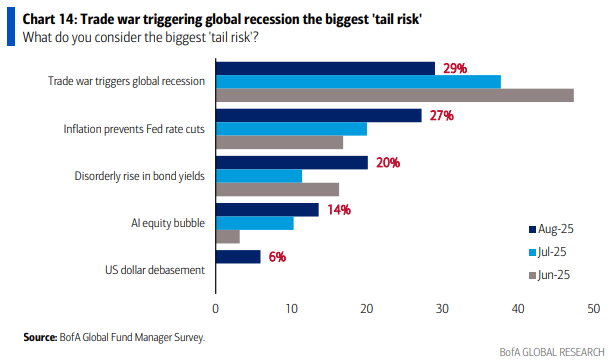 Doch nach Ansicht der Fondsmanager ist die Rezessionsgefahr durch den Handelskrieg gesunken: Während im Juni noch 47 % der Befragten dies als größtes Risiko für die Märkte sahen, ist dieser Anteil inzwischen auf 29 % zurückgegangen. Dafür stiegen die Inflationssorgen sowie die Bedenken zum Anleihemarkt.