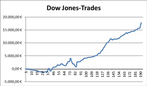 Dieser Ertrag katapultierte die Performance aller bislang beendeten Dow Jones-Trades auf fast +17.800 € steil nach oben.