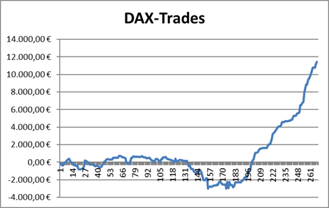 Und mit dem heutigen Ausstieg bei 25.013 Zählern konnten wir einen relativ schnellen Gewinn von 282 € je CFD-Kontrakt erwirtschaften. Damit zeigt die Performance-Kurve aller bislang beendeten DAX-Trades weiter steil nach oben.